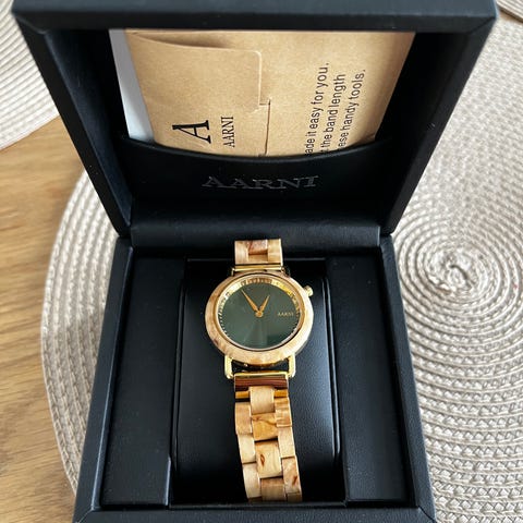 Hyväkuntoinen Aarnin kello. Kellotaulussa ei naarmuja. Hihnassa käytön jälkiä siinä kohden, mistä ollut kiinni (näkyy kuvissa). Ollut reilun vuoden, mutta noin puoli vuotta käyttämättömänä toisen mallin vuoksi. Alkuperäinen paketti mukaan.