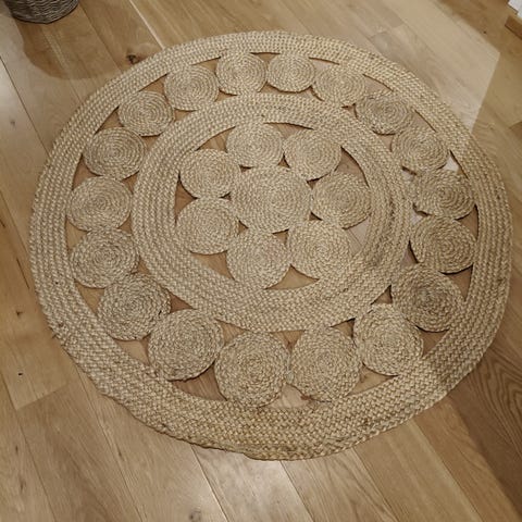 Hiekansävyinen Tekla juuttimatto. Halk. 133 cm. Ollut vain sisäkäytössä.