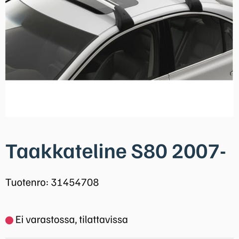 HUOM! Alle puoleen hintaan! UUSI alkuperäinen tehtaanpaketissa oleva käyttämätön VOLVO S80 katto/takkateline sopii -2006 vuosimallisiin asti. Kuten kuvasta näet hinta on 329,99€ mutta tämän saat alle puoleen hintaan 160€. Nyt kannattaa olla nopea, ei varauksia vaan ensimmäiselle myyn. Lisään kuvia kun ehdin. Tarvittaessa voin myös lähettää postimaksua vastaan.