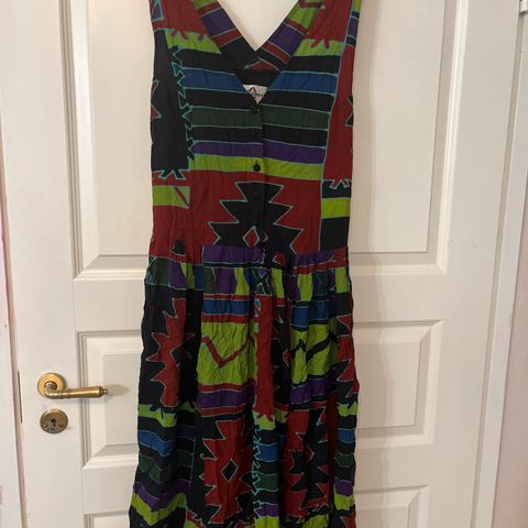 Turkoosi liivihame jonka juju on selkäpuolella. Kiva esimerkiksi ohuen neuleen kanssa.