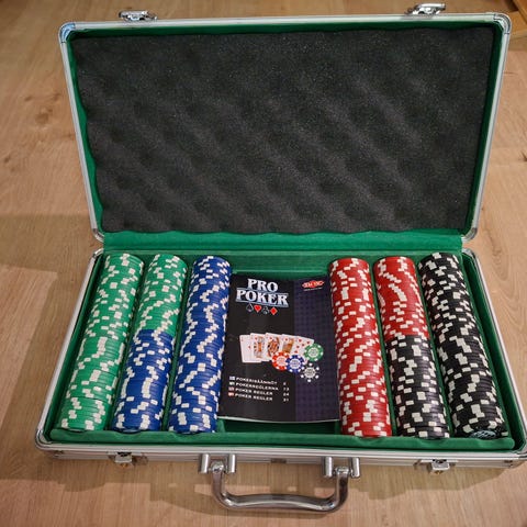 Poker Chips pokerpelisarja sisältää 120 eriväristä pelimerkkiä, 2 korttipakkaa ja jakajan nappulan. Sarja on tarkoitettu pokeripelin pelaamiseen ja toimitetaan metallisessa säilytysrasiossa.