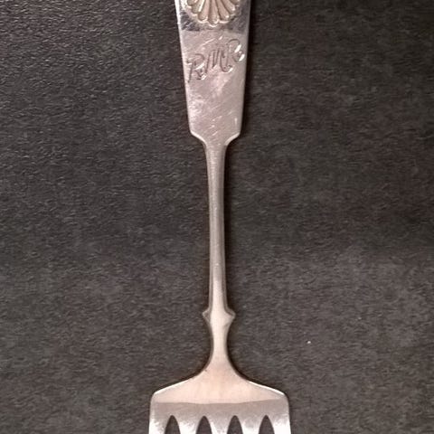 Ilmeisesti nikkelihopeinen kalahaarukka. Leimat G.A.P jokin symboli ja NS.