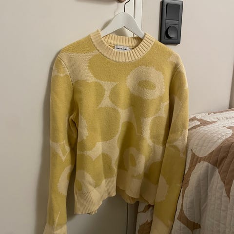 Marimekko neulepusero. Malli Arkki heijastus Unikko. Käyttämätön, laput kiinni. Materiaali puuvillaa. Koko reilu oversize L, mutta menee xl-xxl kokousellekin. Mitat: kainalosta kainaloon 63 cm, olalta helmaan 67 cm ja alaslaskettu hiha kainalosta hihansuuhun 45 cm.