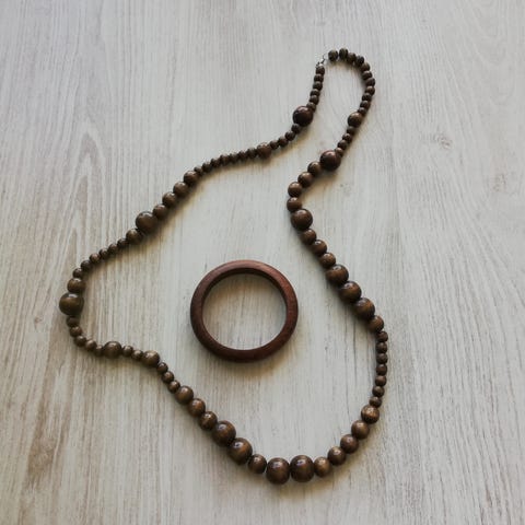 mustat puiset rannerenkaat ja musta kaulakoru puuhelmillä