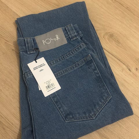 KÄYTTÄMÄTTÖMÄT Polar Skaten 89 Denim farkut. Kaikki laput housuissa edelleen kiinni, kuten kuvista näkyy.