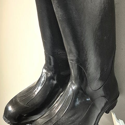 Kumiteräsaappaat, oletus 1960-luvulta. Nahkavarret, kumiterät, varret ehjät mutta pölyiset, kumiterät ehjät, pohjat jo kuluneet. Kokomerkintää ei ole, ulkopohjan pituus 29 cm, koko-oletus 41/42.