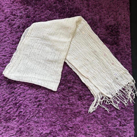 Valkoinen huivi kimaltavilla kukkaispaljeteilla, hieman läpikuultava