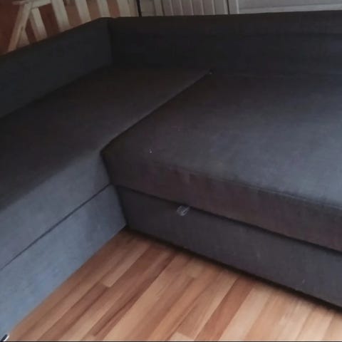 Kuva 1. Divaanivuodesohva. Ihan ok istua, joitakin jousia poikki keskeltä ja divaaniosasta. Vuodevaatelaatikko toimii, mutta kiinnitys ei täysin ehjä. Vuodemekanismi toimii. Leveys noin 230cm ja divaaniosan pituus noin 170cm. Tämä ilmaiseksi hakemisen vaivalla vaikka autotalliin tai bändikämpälle.