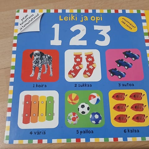 123 kirja opettaa numeroita, laskemista ja muotoja loruillen. Pahvisivut. Ensikirja.