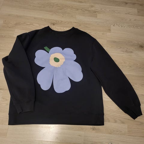 uusi collegepaita, paksu! tummansininen jossa limenvihreät kukat.