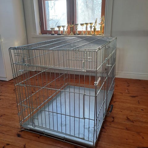 Vanha,mutta käyttökuntoinen metallihäkki. Mukaan häkin mittojen mukaan tehty tikkikangaspeite.