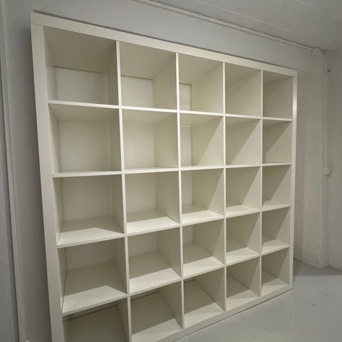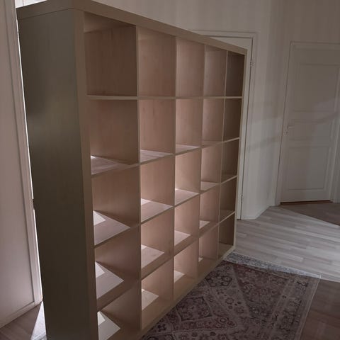 5x5 Kallax hylly vaalean puun värisenä. Yksi välilevyistä puuttuu. Toisessa päädyssä ruuvin reiät. Muutoin ehjä ja ok kunnossa. Joitain käytönjälkiä, mutta ei merkittäviä.