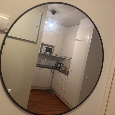 Valkoinen peili 65 halkaisija, jossa vetolaatikko. Laatikkon koko on 43x25cm.