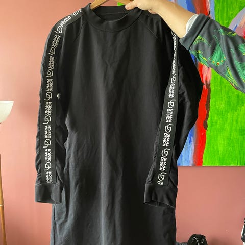 Myynnissä harmaa Uhana Design -collegetunika. Koko M. Pituus olkapäältä helmaan 81 cm, kainalo-kainalo leveys 49 cm. Materiaali ei jousta.
