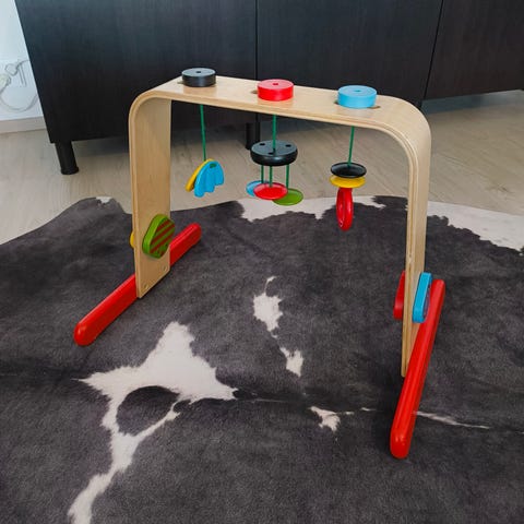 Ikean Leka vauvan puinen leikkikaari, jossa roikkuvia värikkäitä leluja. Kunto hyvä. Nouto.