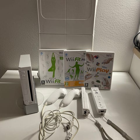 Nintendo Wii -pelikonsoli, kaksi ohjainta, liiketunnistin ja pelit ym. vermeet. Jo useamman vuoden käyttämättä, mutta pelittänee edelleen (ei testattu vaan suoraan kaapista myyntiin).
