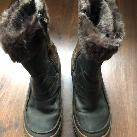 Hyväkuntoiset vähän käytetyt vedenkestävät, lämpöinen fleesevuori, varrellinen ulkojalkine, sis lämmin irrotettava villaseospohjallinen koko 39 pitävät Vibramin talvipohjat, kannassa iskuvaimennin.