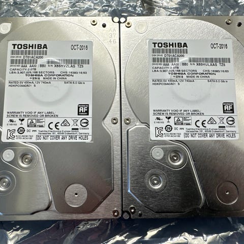 Myydään vain parina, olleet käytössä RAID0-settinä backup-käytössä ja testattu tyhjennyksen yhteydessä täysin toimiviksi. Kuntoraportit myös liitteenä kuvissa.