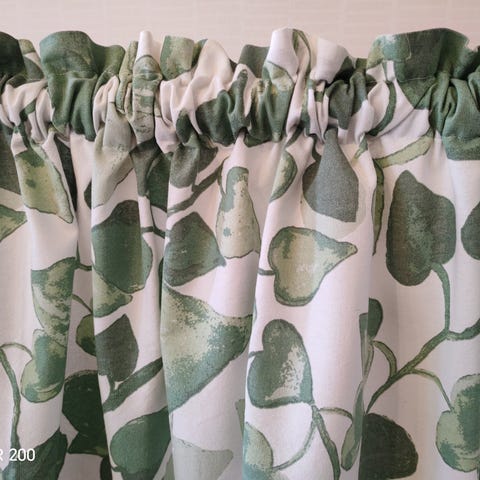 Pääsiäisaiheinen verhokappa jossa on valkoinen pohjaväri ja erilaisia kanan kuvia sekä muita maatalouteen liittyviä kuvia. Materiaali on puuvilla. Kapassa on kaksi tankokujaa 5 cm ja 1,8 cm