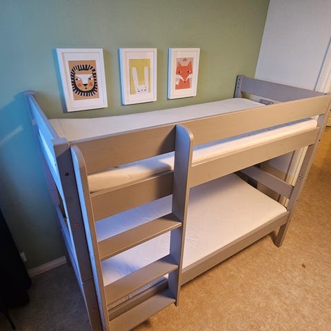 Pieni kerrossänky. Mukaan tulee alasängyssä kiinni oleva laita, sängyaluslaatikko sekä patjat. Sänky on saman tapainen kuin Liisa pieni kerrosänky. Tämä malli on muistaakseni Nova pieni kerrosänky.