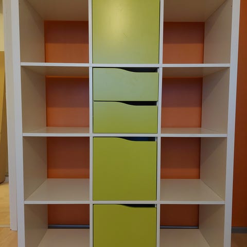 Ikea Kallax 4x4 hyllykkö lipastoilla ja kaapeilla (2 kpl)