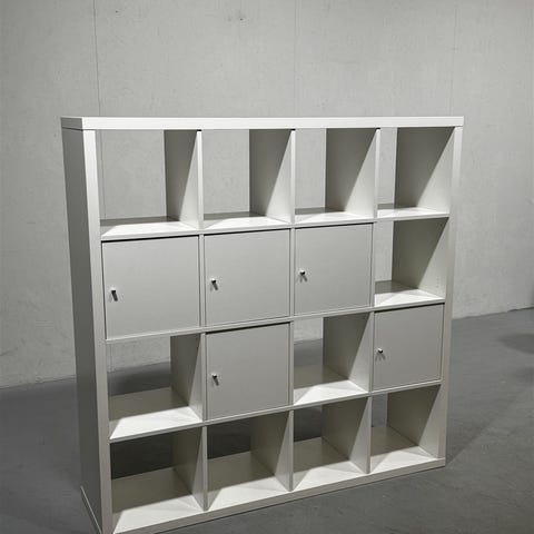 Ikea Kallax malliston 4 x 4 Modulaarinen hyllykkö, jossa on useita avoimia lokeroita, lipastoja ja suljettavia kaappeja. Valkoinen väri antaa modernin ilmeen ja sopii monenlaisiin sisustuksiin. Hyllykkö on suunniteltu tarjoamaan runsaasti säilytystilaa ja se on helposti muunneltavissa tarpeiden mukaan.Hyvä kunto, hinta sisältää 2 kpl.