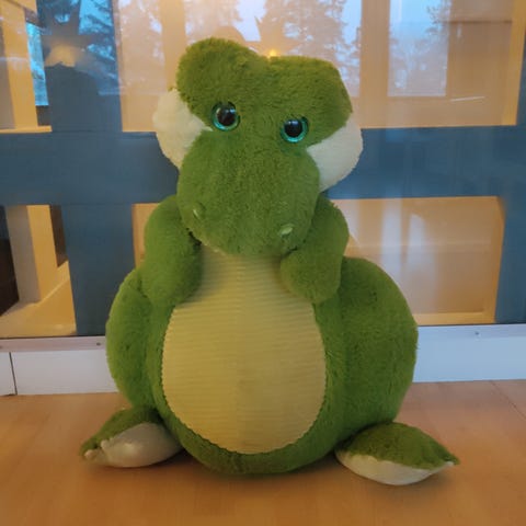 Iso pehmolelukrokotiili, pituus n. 120 cm. Koiratalous.