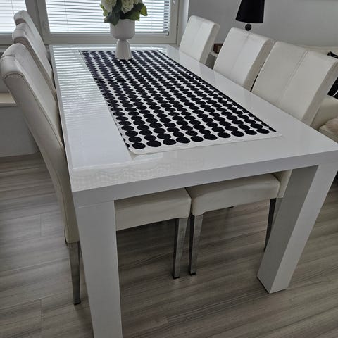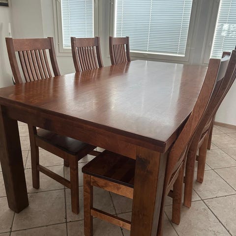 Käytetty mutta hyväkuntoinen ruokailuryhmä kuudella tuolilla ja 80 cm jatkopalalla.