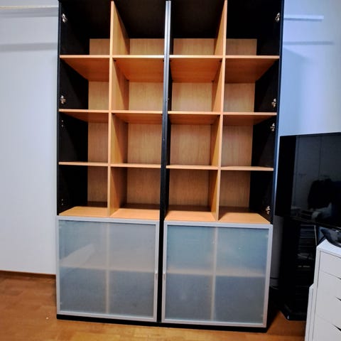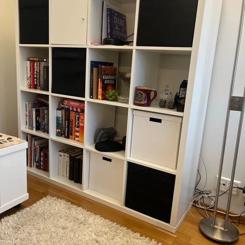 Vajaa vuoden käytössä ollut Ikea LÅDMAKARE tammen sävyinen kirjahylly. Kuvassa näkyvä kokonaisuus eli päätylevyt, kaksi kaappia ovilla ja yksi hyllylevy ilman ovia. Yhdestä hyllylevystä sahattu pieni pala pois pistorasialle. (Ei vaikuta käyttöön eikä näy edestä päin.)