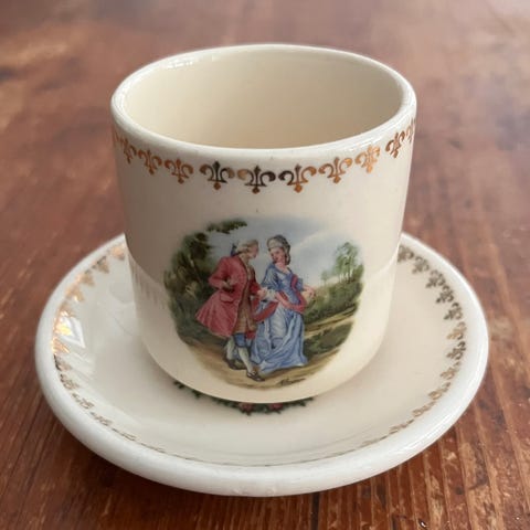 Valkoiset FQ-mallin tarjoiluvadit kultareunalla, 1940-luvun lopulta / 1950-luvun alusta.