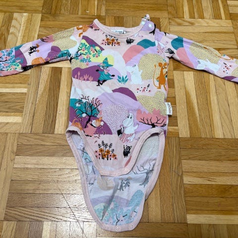 Siisti hyväkuntoinen bodymekko, käytetty koossa 70-76. Bodyn pituus vastaa muumibodyn kokoa 80.