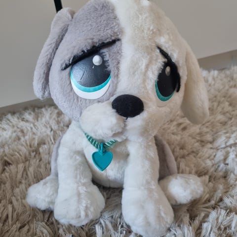 Lasten lelu, jossa pehmoinen koira ja muovinen kuljetuskoppa.