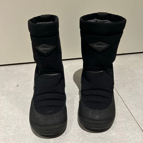 Kuoma lasten talvikengät tytöille, koko 35. Kengissä on pinkki väri ja sydänkuviointi. Kunto ok, mutta kantapäiden kohdalta sisäpuolelta kangas kulunut puhki.