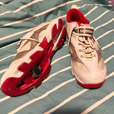Diadoran pyöräily/spinningkengät. Koko 38. Edessä tarrakiinnitys. Käytetty pelkästään sisäpyöräilyssä. Kengät eivät ole juurikaan kuluneet. Pohjissa valmiiksi klossit.