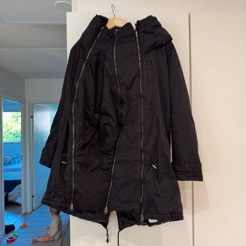 Mamalicious untuvatakki koko L. Lämmin ja mukava odotusajan takki. Irroitettavan vetoketjujatkopalan ansiosta voi käyttää koko raskauden ajan ja jopa raskauden jälkeen tavallisena talvitakkina. Sivutaskujen vuorikankaan saumojen pienet ratkeamat korjausommeltu käsiin, muuten siistikuntoinen ja ehjä takki.