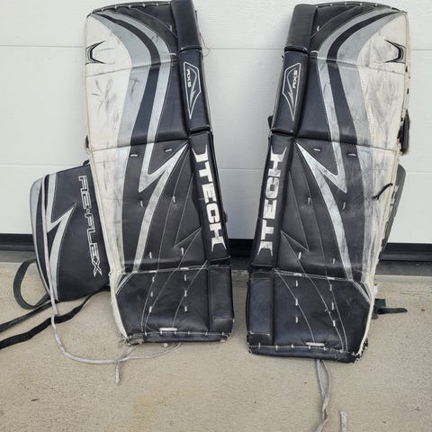 Vanhat patjat, mutta menee harrastekiekossa vielä hyvin. Polven kohta säädettävissä. Remmit ja soljet ehjät. Soljissa hapettumaa. Koko 35+1".