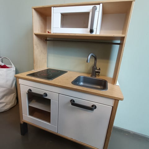 Käytetty, mutta siisti ja toimiva. Mukaan saa kuvissa näkyvät keittiötarvikkeet, joilla leikit saa heti aluille!