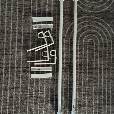 Ikeasta kauan sitten ostettuja ja käyttämättä jääneitä verhotarvikkeita. Riktig-laskosnauhaa 310x7 cm kahdeksan pakettia. Rasiassa Riktig-liukujen lenkkejä ja koukkuja kaupan päälle.