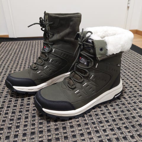 Kerran jalassa pidetyt Haltin lämpimät talvikengät Michelin Ice Grip -kitkapohjalla. Kengät vastaavat uusia kenkiä ja ne ostettu kolme (3) päivää sitten. Kengät ovat hyvin kevyet, siron malliset ja hyvin lämpimät. Kenkiä vartta voi pitää kahdella tavalla, kts. kuvat.