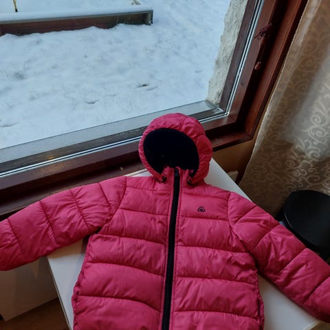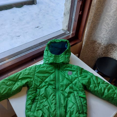 Kauppatakkina ollut. Kauluksessa kulumaa, muuten ehjä. Koko 98.