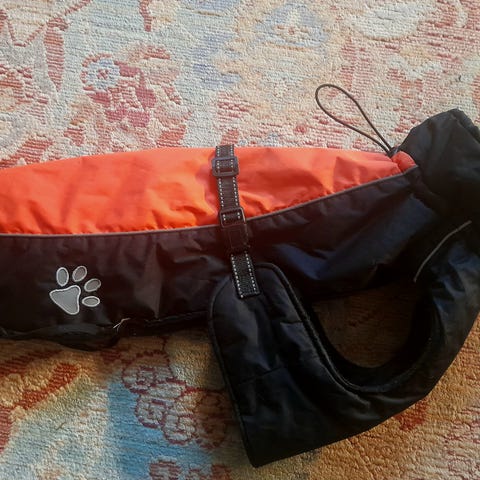 Anionen kaunis, heijastava koiran talvimantteli. Näppärä puettava; kaulassa vetoketju ja vatsan alla tarrakiinnitys. Täysin uusi, vain kokeiltu oman koiran päälle - harmiksi koko oli hieman pieni.