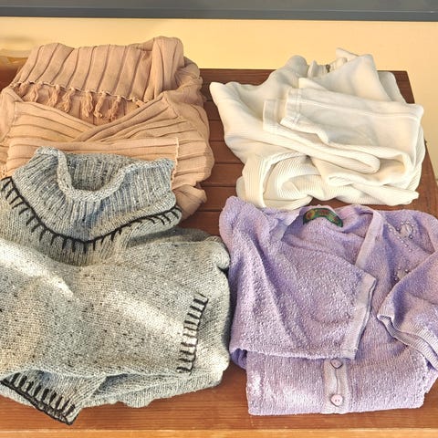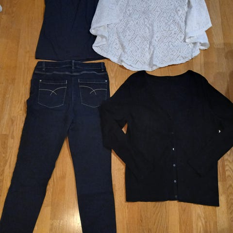 (Pakettiin lisätty Zizzin musta neulemekko, Mapp Jeansin vaaleat joustavat ihanat farkut, mustat joustavat farkut, only harmaa neuletakki xxl, toppeja, Puman viininpunainen collegemekko hupulla, . ym...)