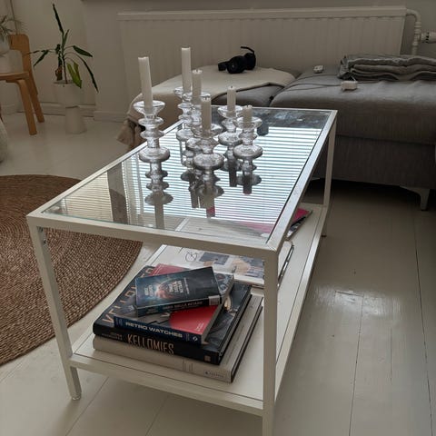 Hieno ja hyväkuntoinen Stockholm- sohvapöytä. Pähkinäpuuviiluinen kansi ja irrotettavat massiivipähkinäpuujalat. Muuttokuljetuksen jäljiltä pieni jälki päädyssä, katso kuva. Pohjan puolella naarmu. Alataso ei ole tallessa.