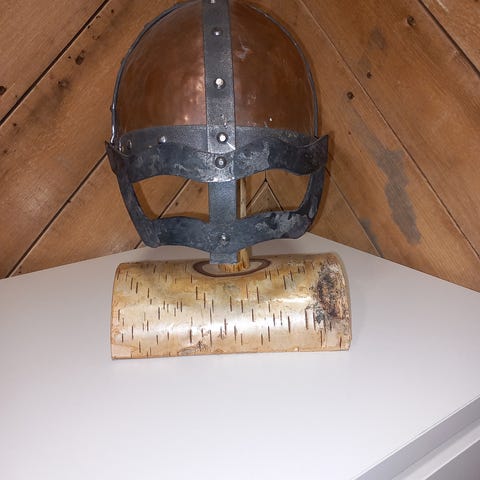 Maalaus, jossa on viikinki-aiheinen hahmo, jossa on sarvipäinen kypärä ja valkoinen parta. Maalauksessa on lämminsävyinen tausta. Mitat 24cm x 19cm.