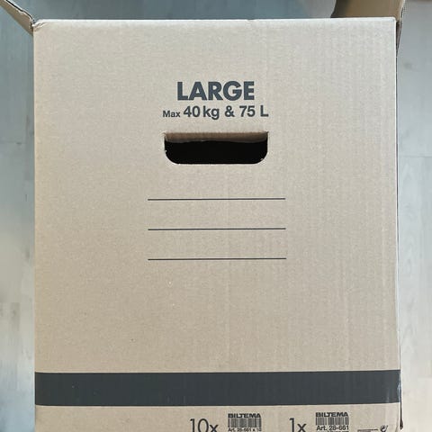 10kpl Bilteman 40kg laatikoita ja 5kpl Ikean 30kg laatikoita. Kaupan päälle saa kaksi kuluneempaa Bilteman laatikkoa.