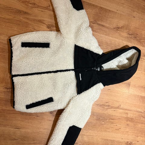 Hyvässä kunnossa oleva valkoinen teddy-takki. Vetoketju ja taskut kunnossa. Vaatteen kunnossa ei ole moitteita. Koko M.