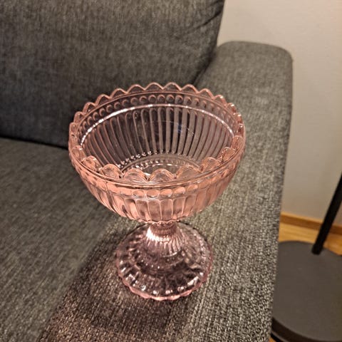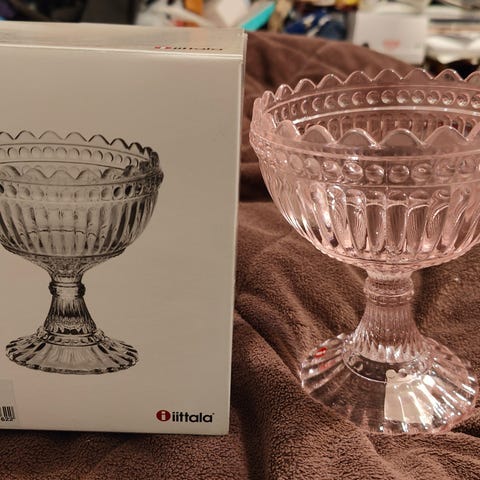 Iittala Mariskooli -koristekulho vaaleanpunaisesta lasista /sweet pink, 155mm. Kuin uusi, säilytetty kaapissa, ei ole ollut käytössä, eikä esillä.