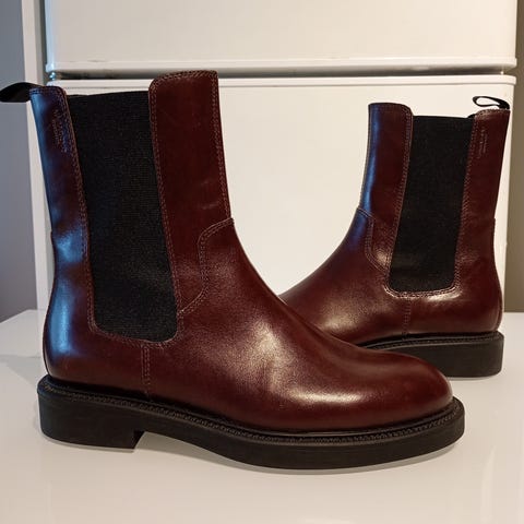 Vagabond saappaat, koko 38, valmistettu ruskeasta mokasta. Saappaissa on sivuvetoketju ja paksu korko. Sopivat naisten käyttöön.