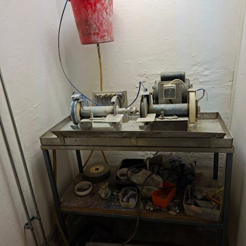 Kivenhiontakone, kivisaha yms. tarvikkeita ja kiviä