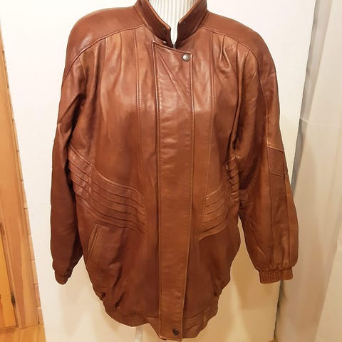 Ruskea nahkatakki vanuvuorella k.36. Vanha, käyttämätön. Pehmeää nahkaa. Kainalo/kainalo 63 cm, niska-helma 75 cm, hihan pituus olkapäästä 60 cm. Reilun kokoinen.